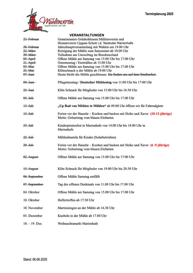 Die Mühle im Mühlenloog 40, 26529 Upgant-Schott, ist das Zentrum von Upgant-Schott. Sie ist von April bis Oktober jeden 1. Samstag im Monat von 15:00 bis 17:00 geöffnet. Die Besucher werden von fachkundigen Vereinsmitgliedern geführt, zudem wird Kaffee, Tee und Krintstuut angeboten.